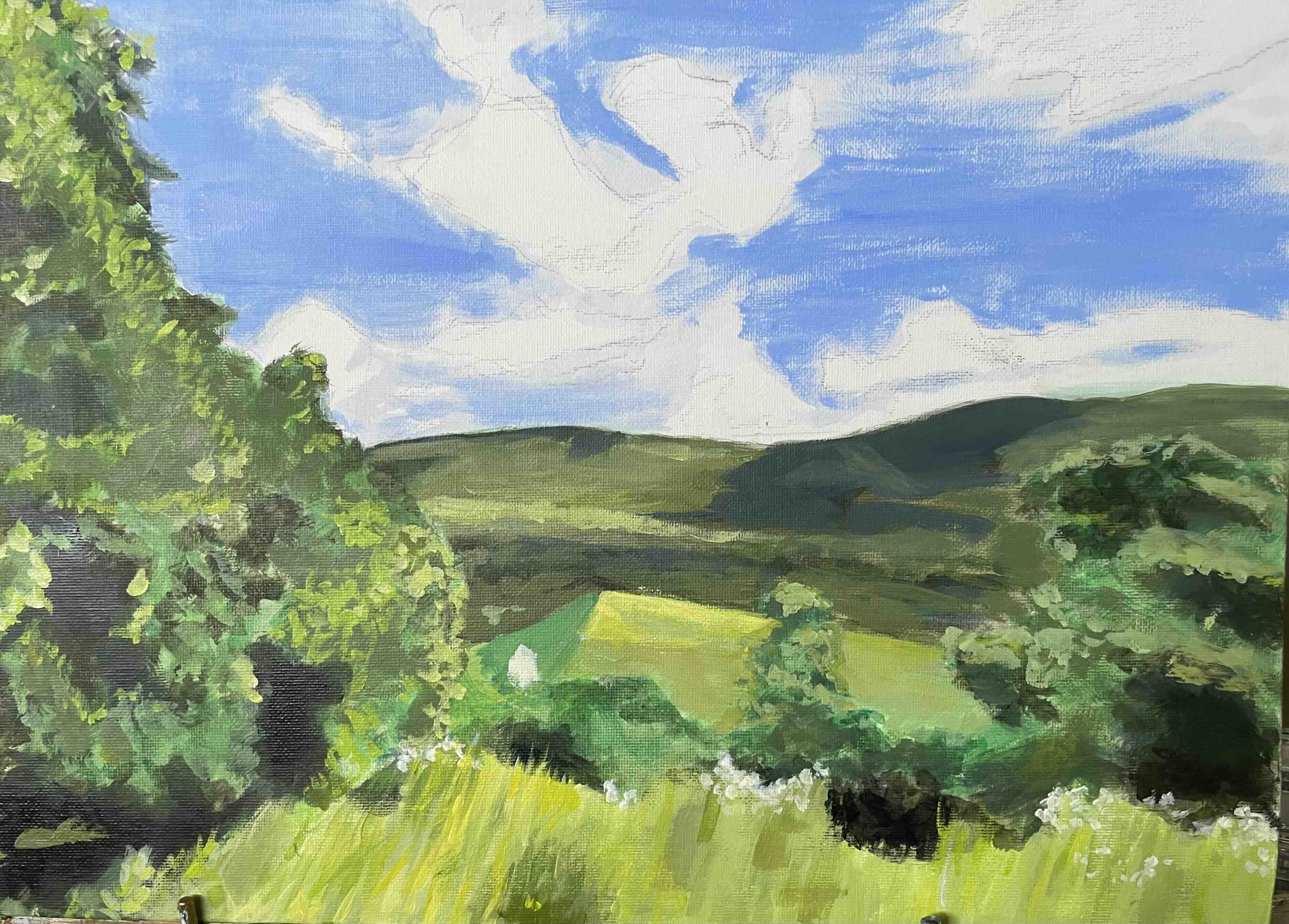 I paint in acrylics on canvas. Here's my outdoor easel sitting in my indoor studio with a white daylight LED floodlight, and a computer with my reference photographs.